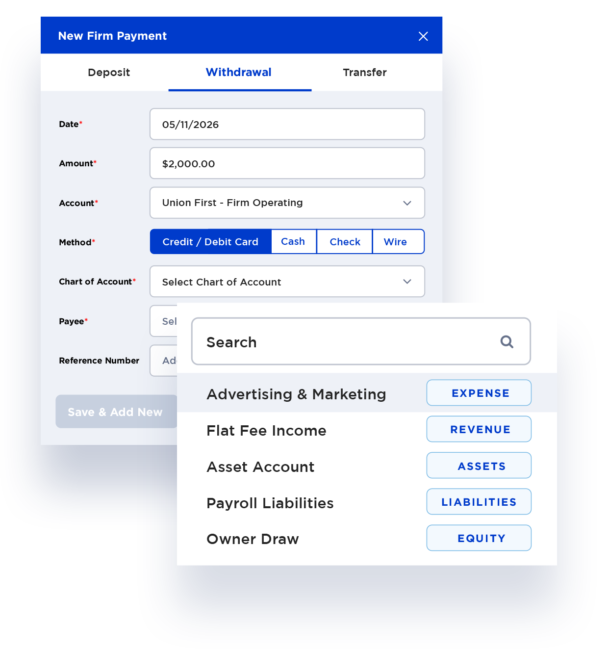 Simplify day-to-day management of firm finances via the customizable Chart of Accounts. Fully customize how your income and expenses are classified, with flexible organization across items, categories, payments, and expense types.